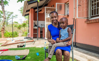 Nurse Otrine Dhlodhlo Haakonde with her son Ethan in front of their house in rural Mpanshya.