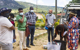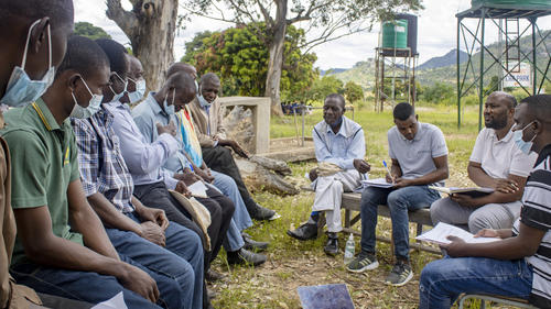 Kuda Madzeke (links) mit seinem Team bei der Vorbereitung einer Umfrage mit Patienten von nicht-übertragbaren Krankheiten im Distrikt Buhera.