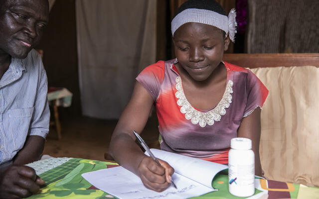«Mir geht es gut», antwortet Mary, «ich fühle mich gesund. Und schau, hier sind meine Noten vom letzten Quartal». Die 21-jährige Vivian, selbst HIV-positiv und heute Mitarbeiterin von DAMKA, schaut das Zeugnis an und notiert sich etwas im aufgeschlagenen Ordner.